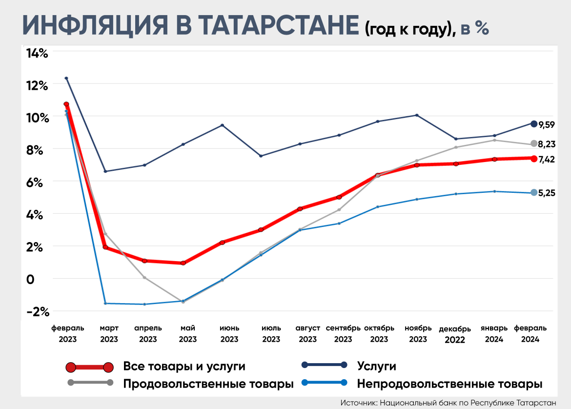 Нацбанк Татарстана наконец-то подвел инфляционные итоги февраля. Рост цен в годовом выражении в Татарстане продолжается, пусть и слабыми темпами – так, в феврале показатель вырос до 7,42% после 7,34% в январе.