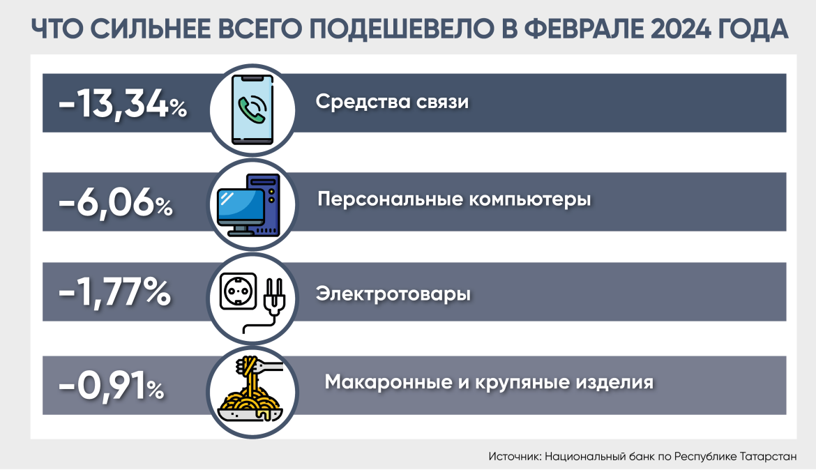 В случае с непродовольственными товарами основной фактор замедления роста цен – «некоторое снижение спроса на отдельные товары», главным образом длительного пользования. «Как итог – годовой рост цен на подержанные иномарки замедлился, а стиральные машины и холодильники дешевели сильнее, чем в январе», – отметили в Нацбанке РТ.