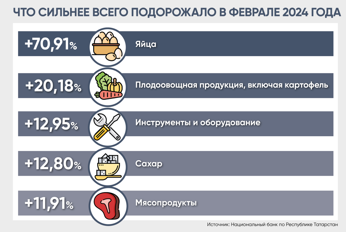 В целом основные волатильные категории в продуктовой рознице в феврале дорожали медленнее, чем месяцем ранее, – это касается и яиц, и овощей с фруктами (по итогам февраля, по данным Росстата, куриные яйца в среднем в рознице в стране стоили 129,17 рубля за десяток). Без учета плодоовощной продукции, кстати, по расчетам Татарстанстата, продуктовая инфляция в феврале в республике составила 6,8%.