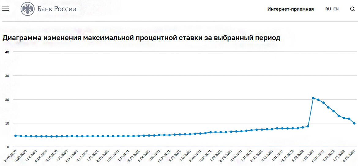 Банк России резко повысил ключевую ставку после введения антироссийских санкций – в феврале она увеличилась с 9,5% годовых сразу до 20%. А в результате, по данным ЦБ, максимальная процентная ставка по вкладам в российских рублях десяти банков, привлекающих наибольший объем депозитов физических лиц, выросла с 8,1% в середине февраля до 20,5% годовых в марте. Предложения на рынке достигали 25% годовых.