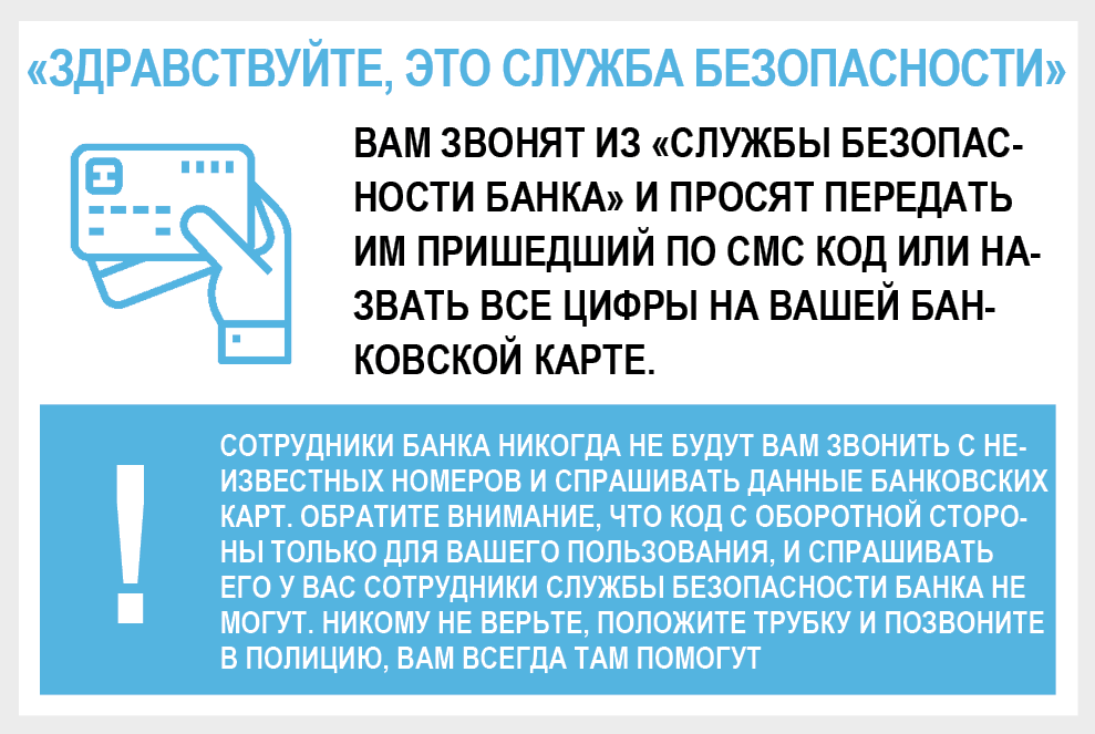 Второй по популярности в Татарстане способ мошенничества – это «защита от несанкционированного списания денежных средств». Например, вам звонят из службы безопасности банка и просят передать им пришедший по СМС код или назвать цифры с оборотной стороны вашей банковской карты.