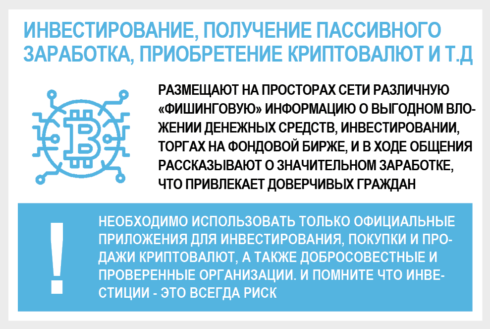 Мошенничества под предлогом инвестирования, получения пассивного заработка, приобретения криптовалюты