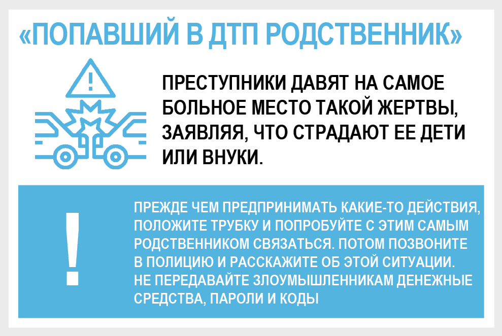 Схема «попавший в ДТП родственник» больше нацелена на пожилых татарстанцев. Преступники давят на самое больное место такой жертвы, убеждая, что страдают ее дети или внуки.
