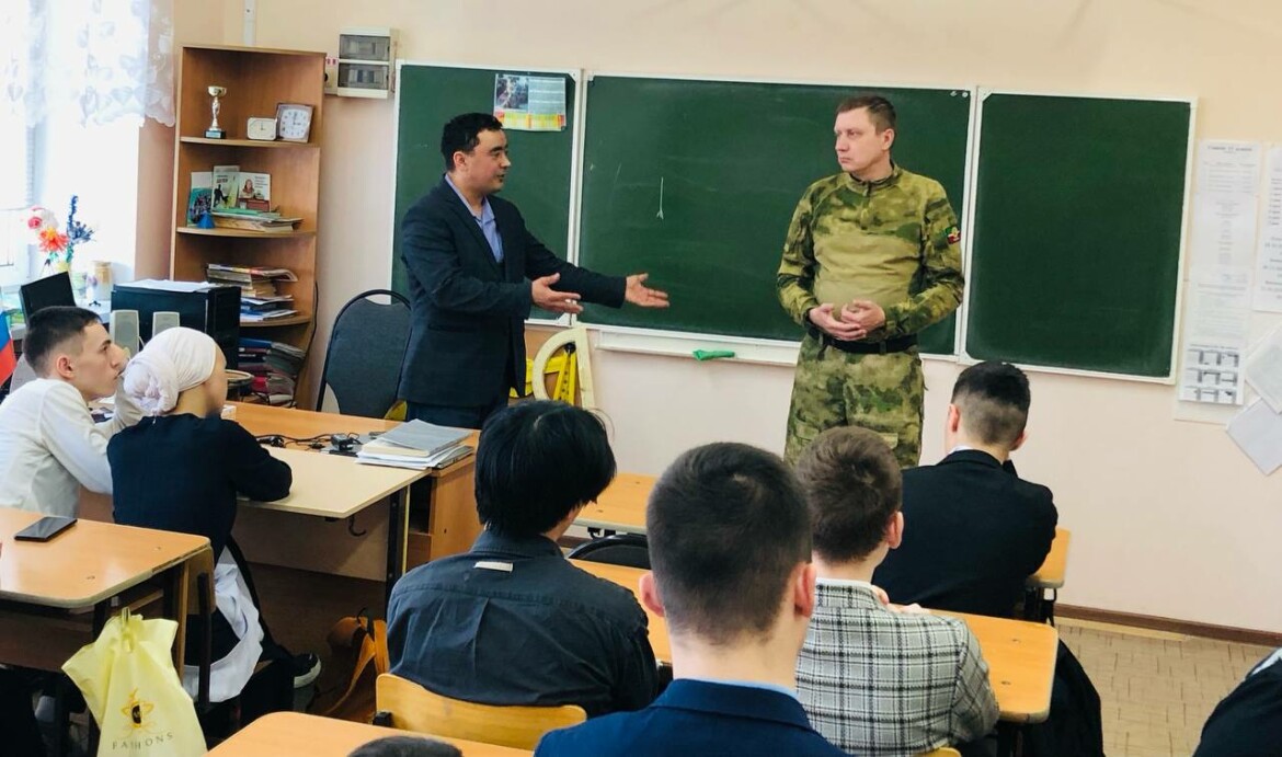 В Васильевской школе №3 Зеленодольского района состоялась встреча учащихся с фельдшером, который приехал в отпуск из зоны спецоперации. Военнослужащий побеседовал с учениками 9-х, 10-х и 11-х классов.