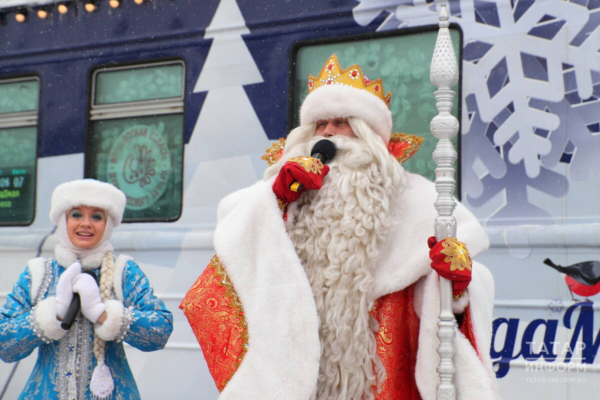 На железнодорожный вокзал «Казань» сегодня прибыл празднично украшенный поезд Деда Мороза. На перроне главного волшебника страны и его внучку – Снегурочку – радостно встретили взрослые и дети.