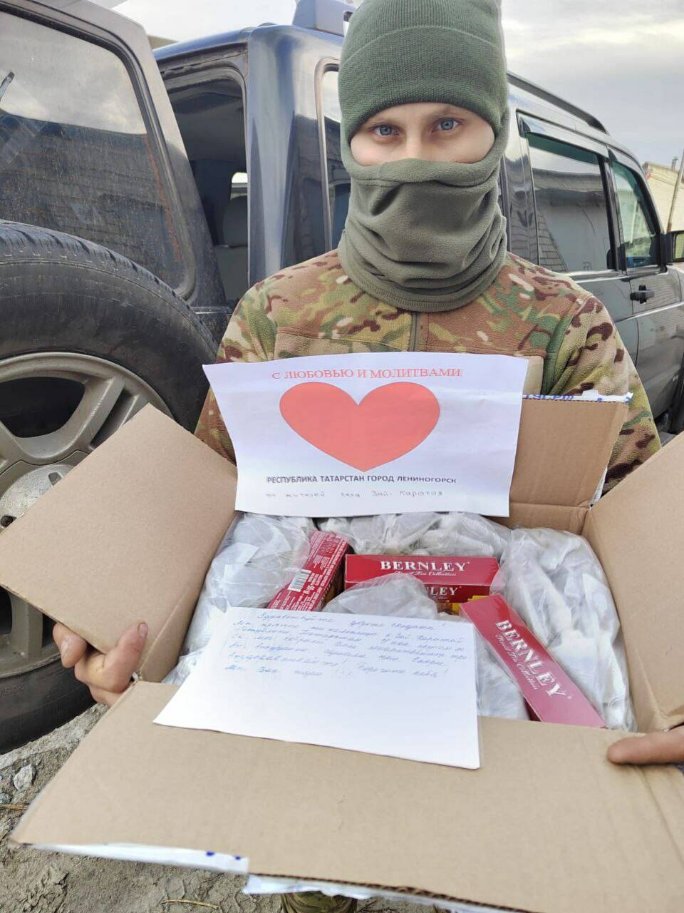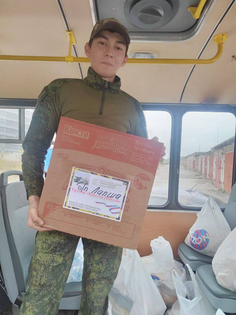 Чтобы помочь погрузке груза, пришел действующий боец — 22-летний Айрат с позывным Арчи. Именные посылки получит и прапорщик Юра с позывным Малыш — двухметровый богатырь весом более 160 килограммов.