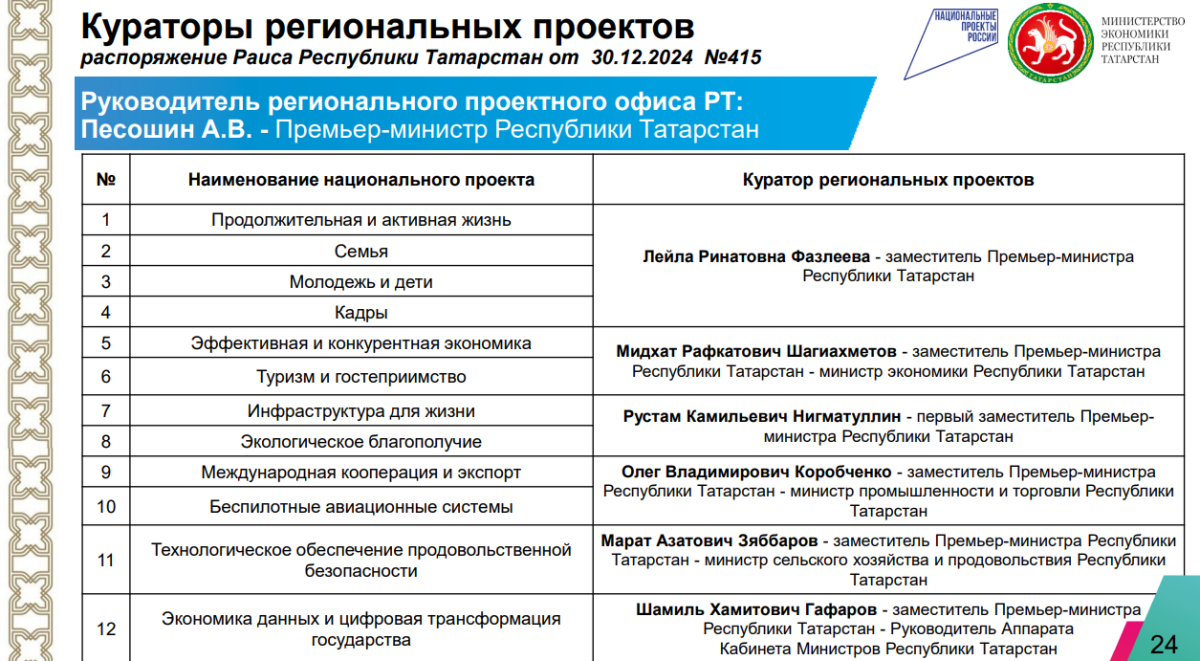 С начала 2025 года в Татарстане начали реализовывать 12 национальных проектов: «Семья», «Молодежь и дети», «Продолжительная и активная жизнь», «Инфраструктура для жизни», «Экологическое благополучие», «Кадры», «Эффективная и конкурентная экономика», «Технологическое обеспечение продовольственной безопасности», «Туризм и гостеприимство», «Международная кооперация и экспорт», «Экономика данных и цифровая трансформация государства» и «Беспилотные авиационные системы».