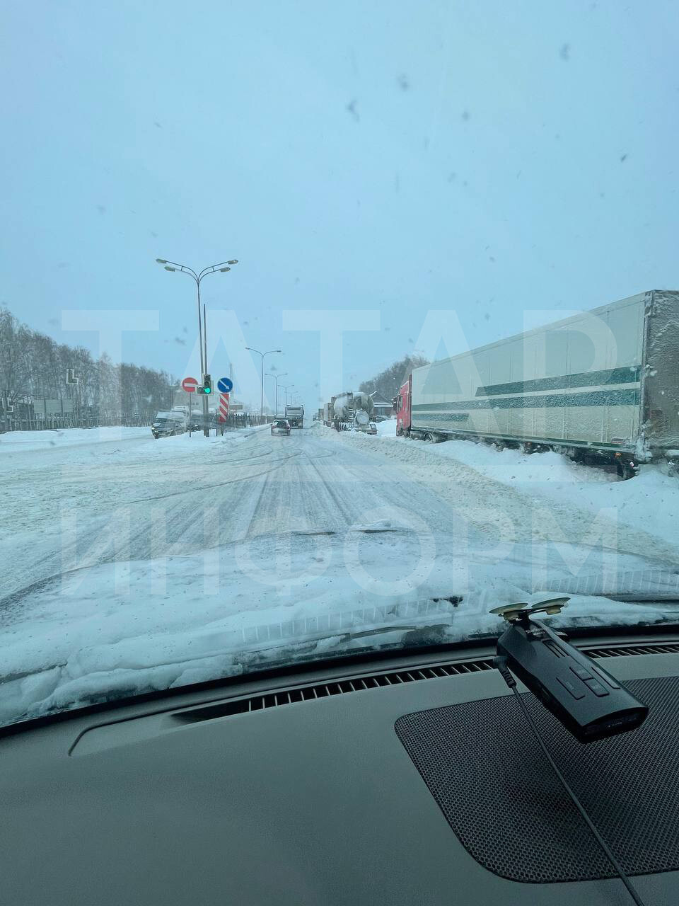 Видео: На Мамадышском тракте из-за непогоды фуры второй день блокируют выезд из Казани