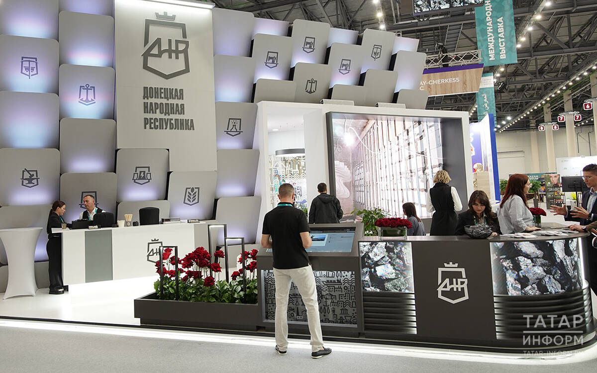 Внимание привлекает стенд Донецкой Народной Республики. Он выполнен в темно-сером цвете. Как объяснила «Татар-информу» начальник отдела сопровождения инвестиционных проектов ГК «Корпорация развития Донбасса» Егана Алиева, экспозиция сделана в цветах национальной айдентики региона, это отсылка к угольным шахтам.