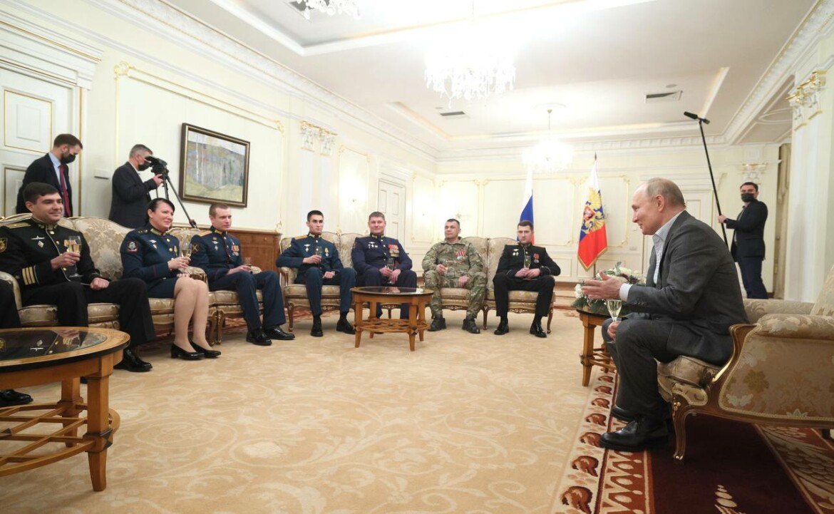 Путин сказал, что вручать боевые награды не будет, но подготовил всем участникам встречи подарки, среди которых были и упомянутые выше табельное личное оружие и президентский штандарт.
