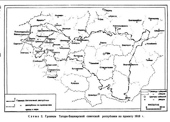 Схема Татаро-Башкирской Республики, 1918 год. По книге Р. М. Раимова. Образование Башкирской Автономной Советской Социалистической Республики (1952)