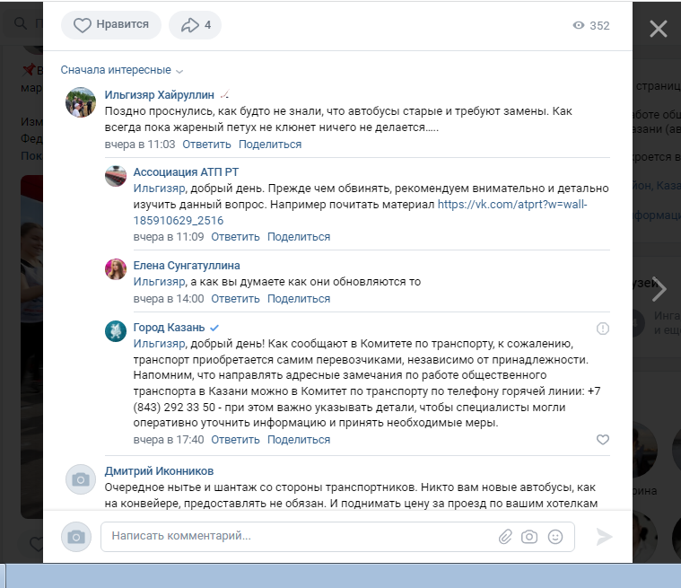 В комментарии под постом, который опубликовала Ассоциация АТП РТ в соцсетях, пришли сотрудники мэрии, которые напомнили, что замена транспорта должна происходить по инициативе транспортных предприятий.