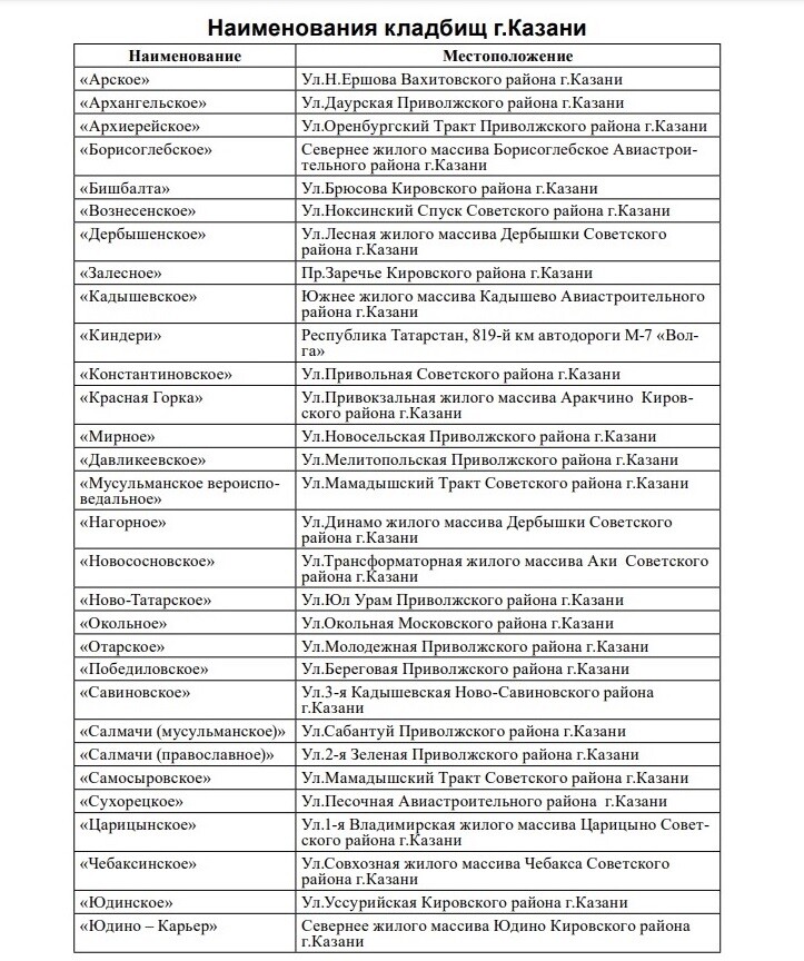 «Руководствуясь федеральными законами от 12.01.1996 № 8-ФЗ „О погребении и похоронном деле“ и от 06.10.2003 № 131-ФЗ „Об общих принципах организации местного самоуправления в Российской Федерации“, постановляю утвердить наименования кладбищ г. Казани», — говорится в документе, подписанном руководителем исполкома города Рустемом Гафаровым.