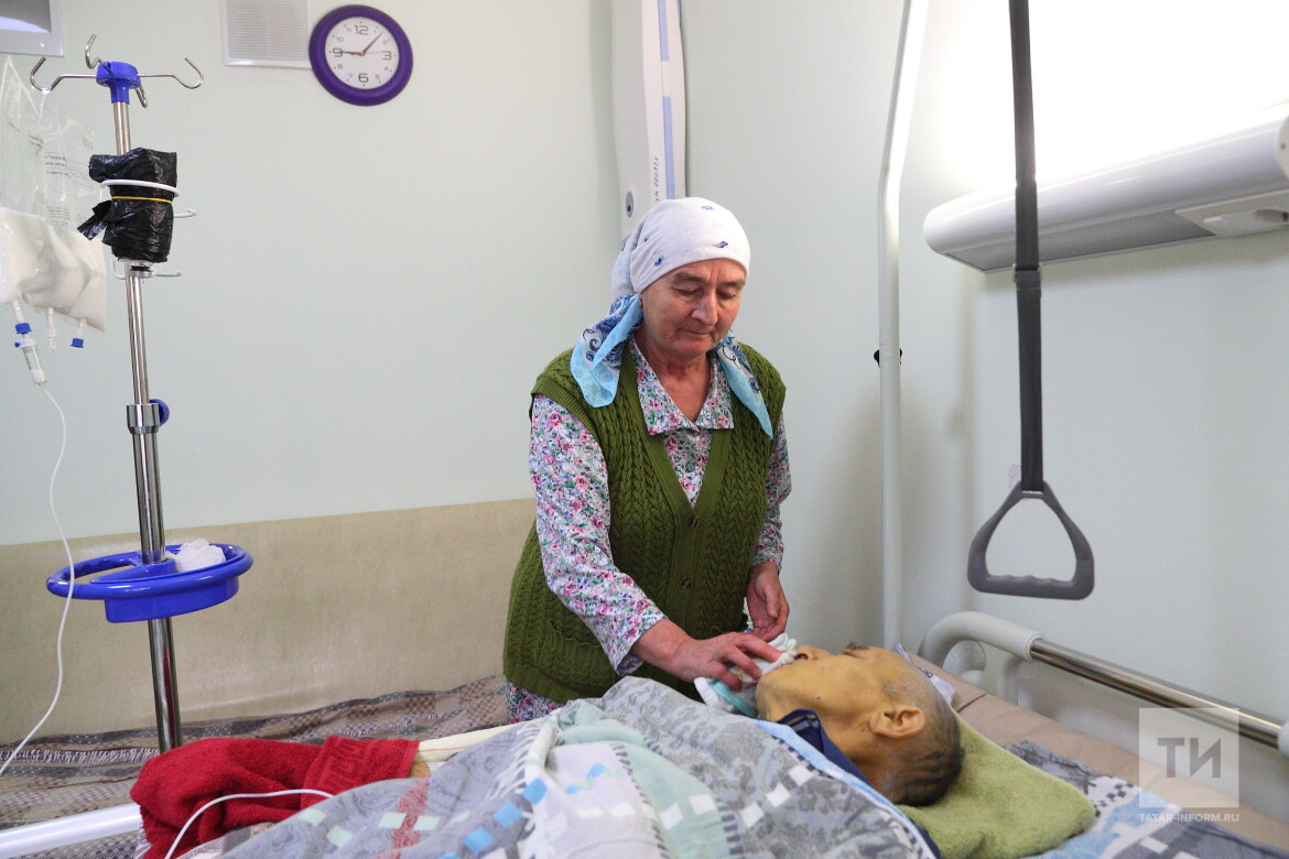 Главный врач хосписа Галия Хисамова рассказала, что ежедневно за пациентами ухаживают 60 сотрудников. Во взрослом отделении постоянно находятся два врача, медсестры и социальный работник. Большинство пожилых обитателей хосписа прикованы к постели, для их удобства у каждой кровати находятся кнопки вызова.