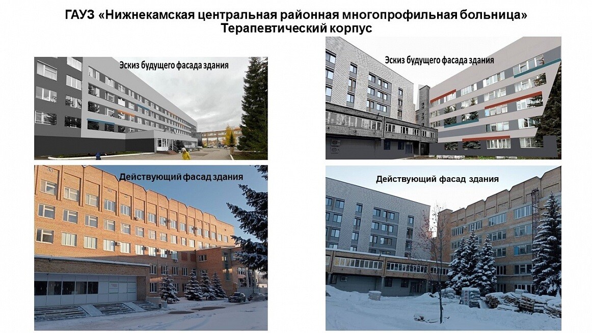 Один из значимых пунктов в программе — ремонт терапевтического корпуса Нижнекамской районной больницы. На первый этап уже выделено 335 млн рублей, на второй ожидается аналогичная сумма. На эти средства планируется выполнить ремонт кровли, заменить окна и двери, инженерные сети, а также обновить фасад.