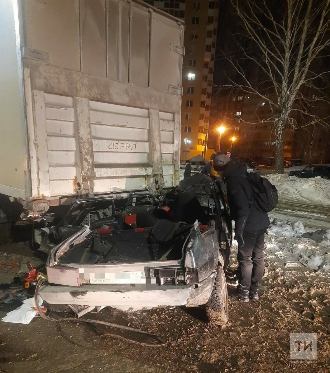 Как стало известно «Татар-информу» от очевидцев происшествия, водитель легковушки «Лада» на большой скорости влетел в фуру Iveco. Машина практически полностью оказалась под большегрузом.