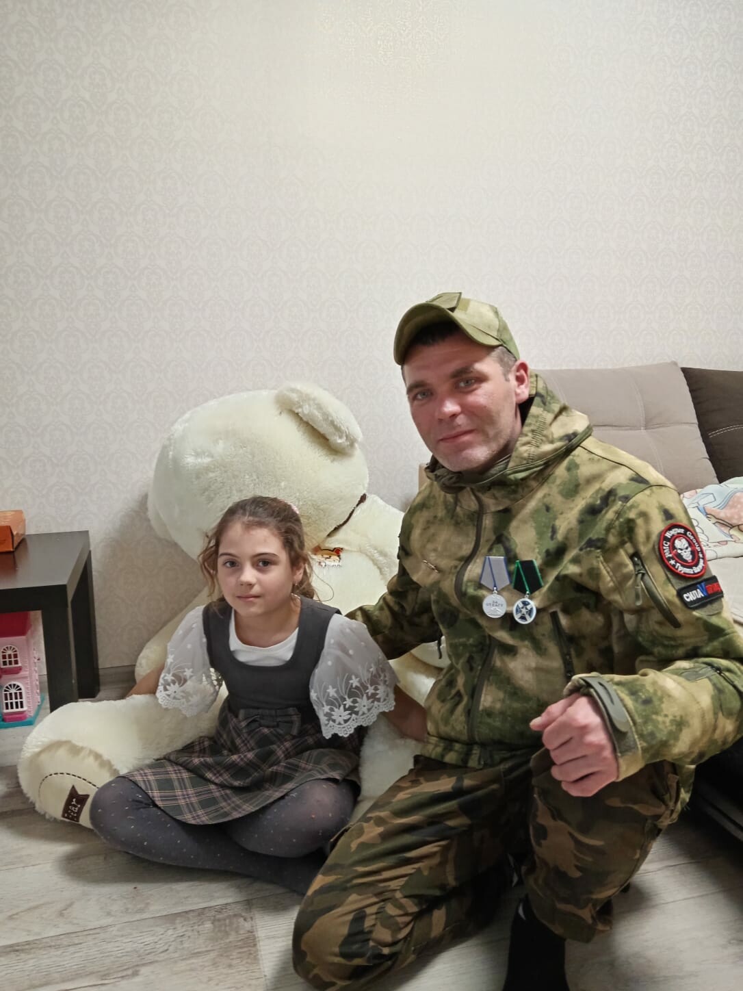 А большого белого плюшевого медведя счастливый папа принес дочке. «Несколько секунд Ариша стояла, как вкопанная, а потом кинулась меня обнимать и долго не хотела выпускать из объятий, прижимаясь к дорогому папе. Этот миг на всю жизнь останется в памяти!» — улыбаясь, признается Николай.