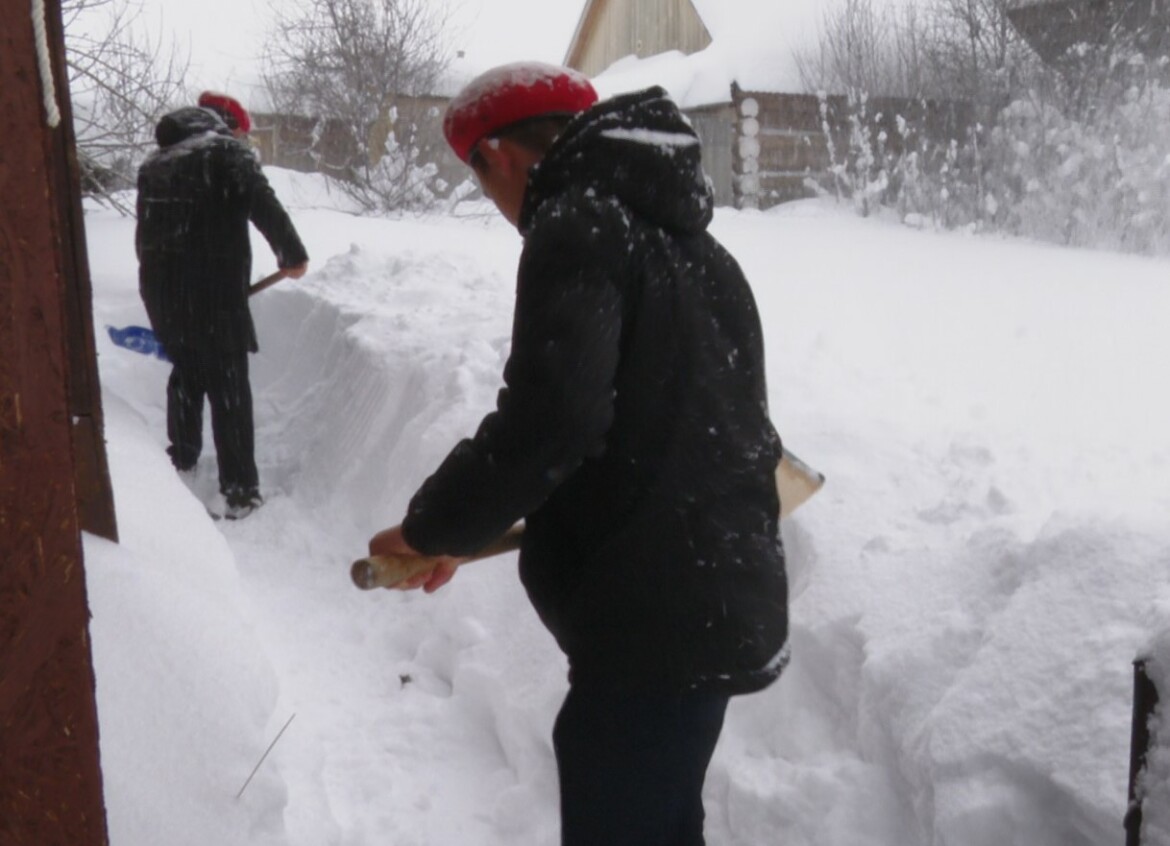 Снег во дворе пожилой женщины чистит соцработник, но из-за регулярных снегопадов его меньше не становится. Юноши и девушки расширили тропинки, сбили снег с крыши. Работали дружно и быстро — вскоре двор был очищен и приведен в порядок.