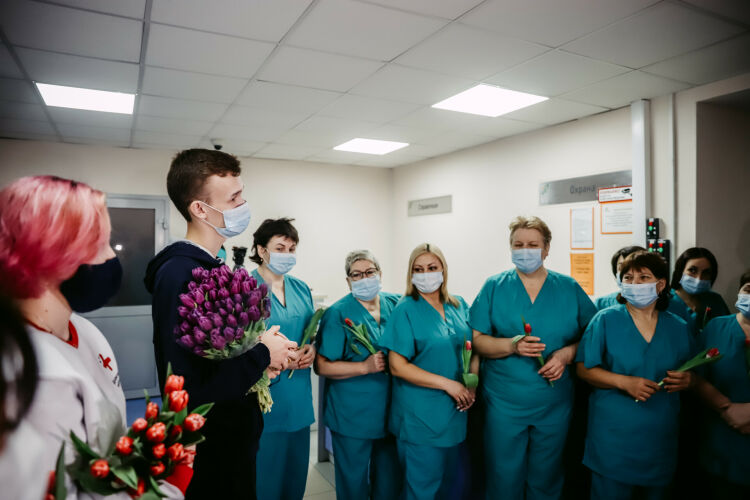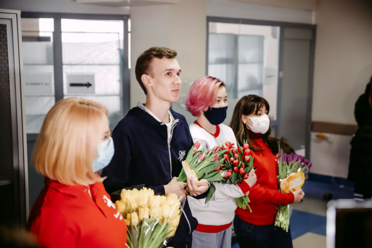 Волонтеры-медики подарили сотрудникам больницы и пациентам цветы и валентинки.