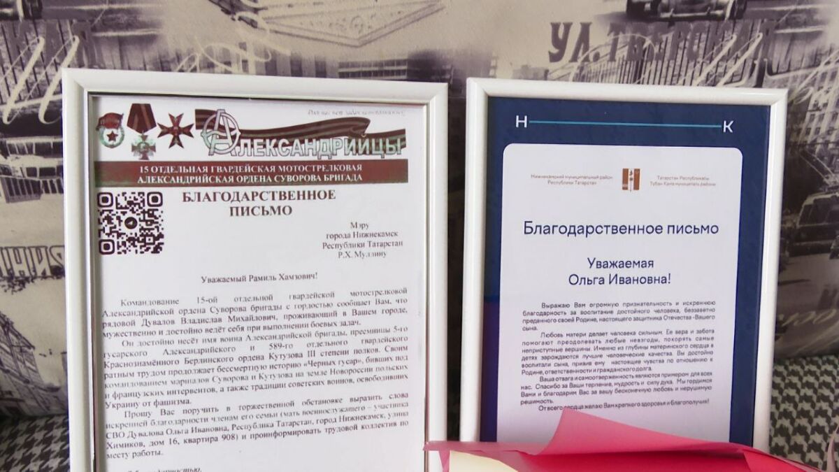 «Мы вот прямо скопировали. Сделали в рамочку, чтобы у вас было письмо на имя Рамиля Муллина. Вот именно благодарность за вашего сына. За воспитание вашего героя», - показали нижнекамке заветное письмо.