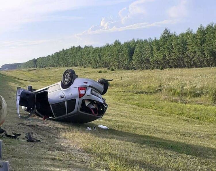 В аварии на трассе столкнулись сразу три машины, одна из которых вылетела в кювет и перевернулась.