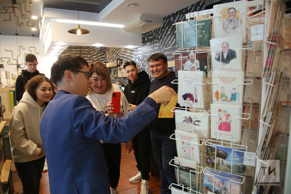 Тут же, на первом этаже «Татмедиа», гости зашли в недавно заработавшее литературное кафе. Блогерам показали новинку в татарской литературе – книги в популярном формате «карманной книги», а также открытки на татарском языке от студии «Хатлар йорты». В серии карманных книг от журнала «Казан утлары» были опубликованы также произведения башкортостанских авторов. Особенно понравились гостям открытки, а среди них те, на которых изображен Минтимер Шаймиев. Они подписаны коронными фразами первого Президента Татарстана: «Кешеләрне яратырга кирәк» («Людей надо любить») и «Без булдырабыз» («Мы можем!»). Повеселила гостей и шуточная надпись на открытке «Ниеңнең ниен нитәсем килә», доказывающая, что иногда татарам, чтобы объясниться, достаточно лишь одного местоимения.