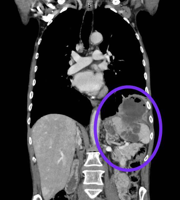 По словам врачей, за свою практику они впервые увидели опухоль нижней доли легкого, которая сквозь диафрагму проросла в селезенку и при этом некротизировалась.