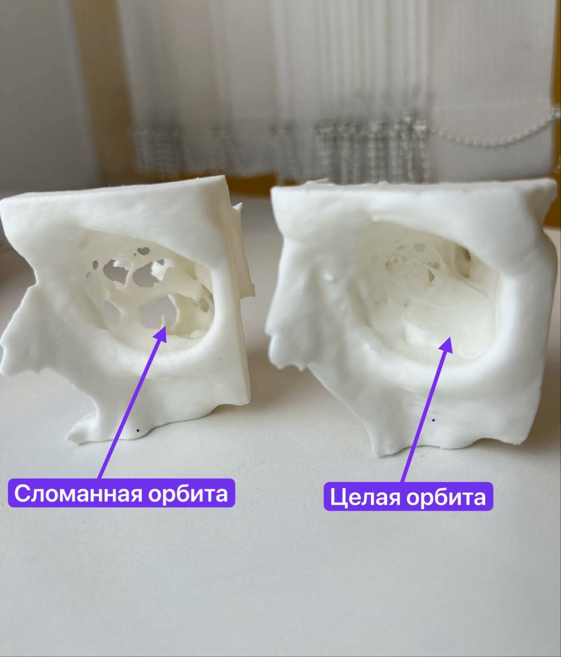 Мужчине диагностировали перелом дна орбиты и направили в РКБ. С помощью компьютерной томографии и 3Д-принтера медики смоделировали часть черепа с переломом и определились с необходимым материалом для реконструкции.