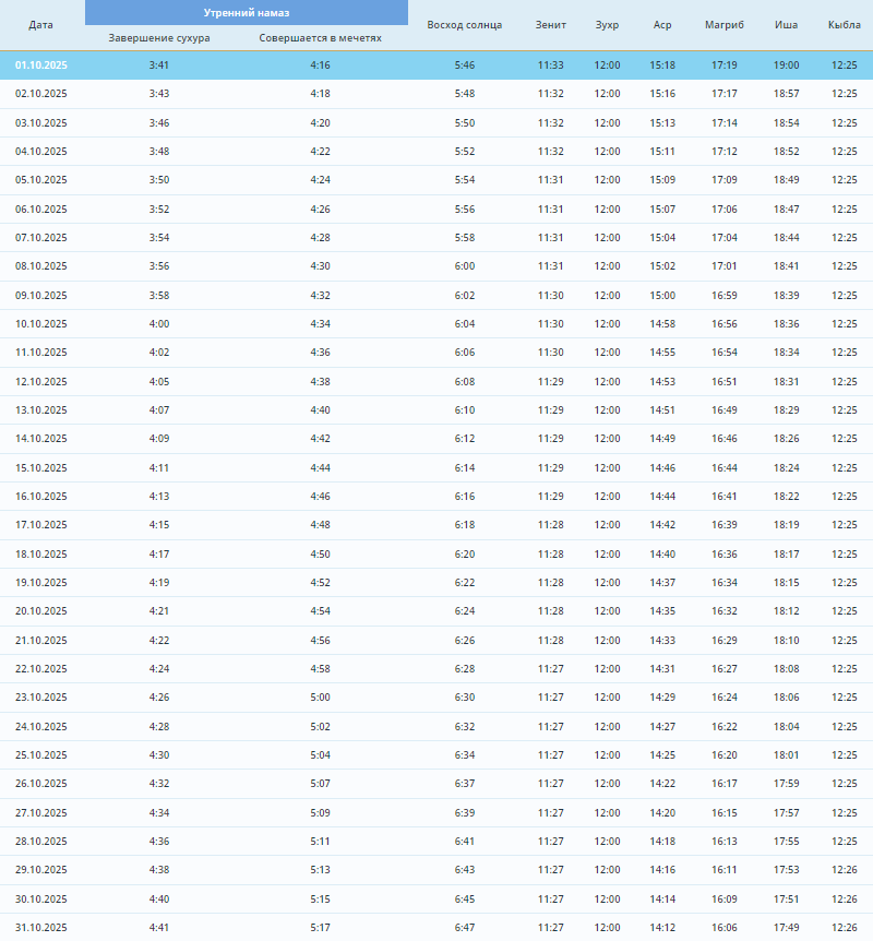 Духовное управление мусульман Татарстана опубликовало время намазов в Казани на октябрь 2025 года.