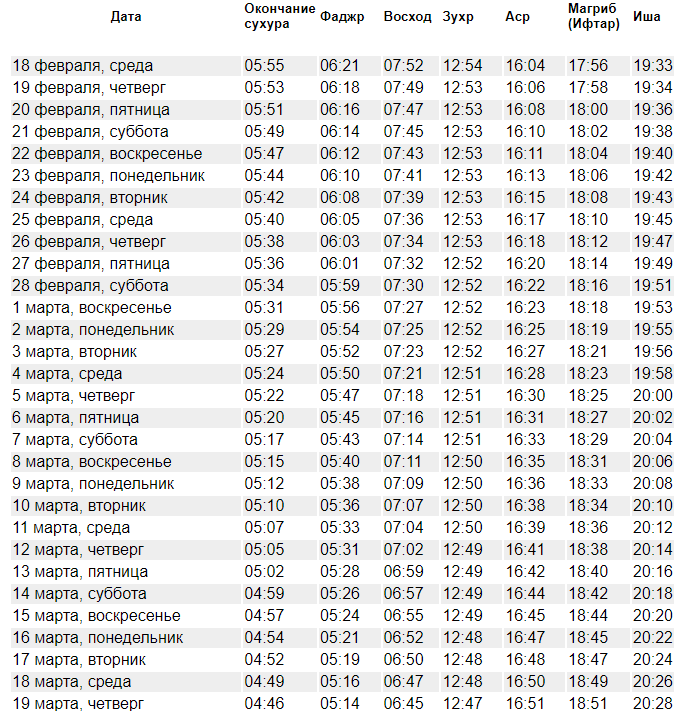 Время сухура, ифтара и намаза в Самаре на Рамадан-2026
