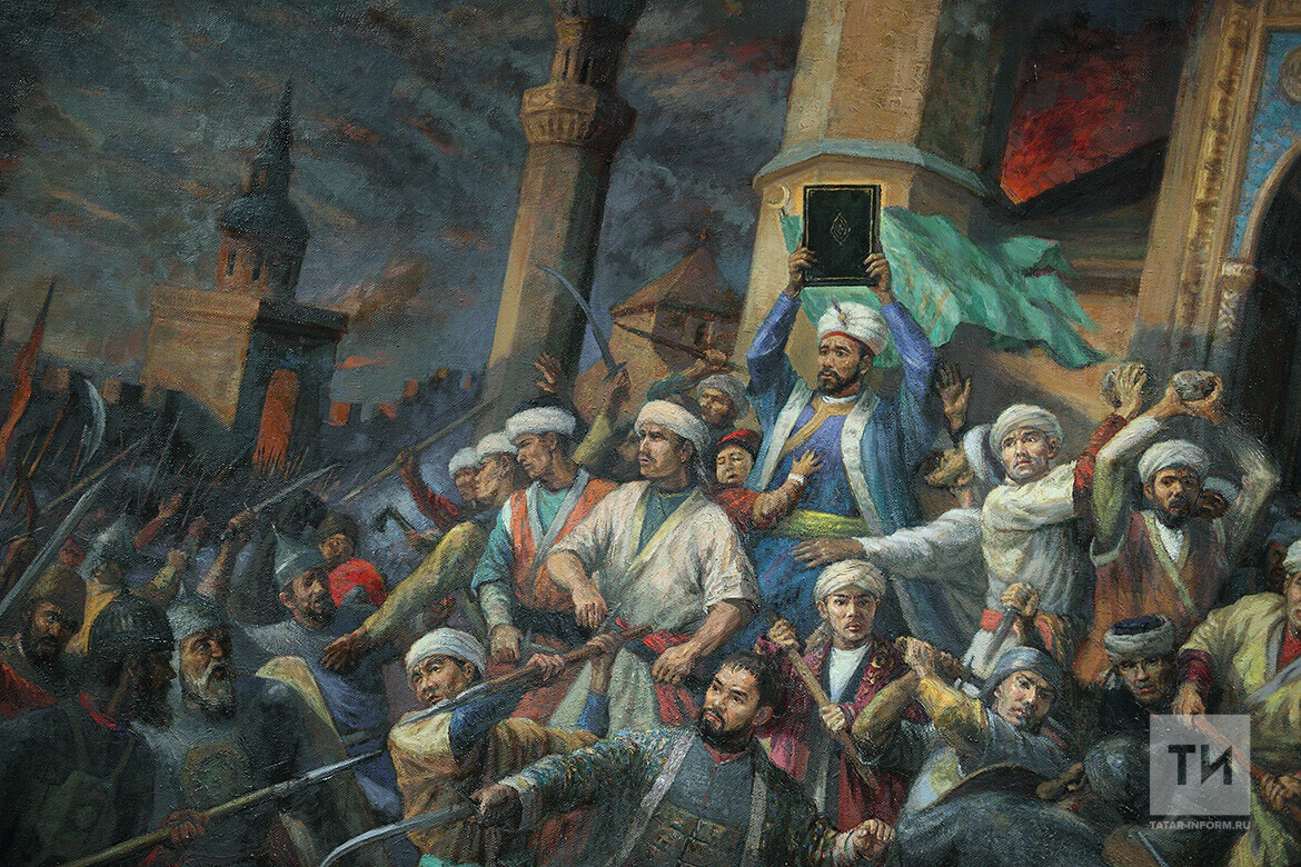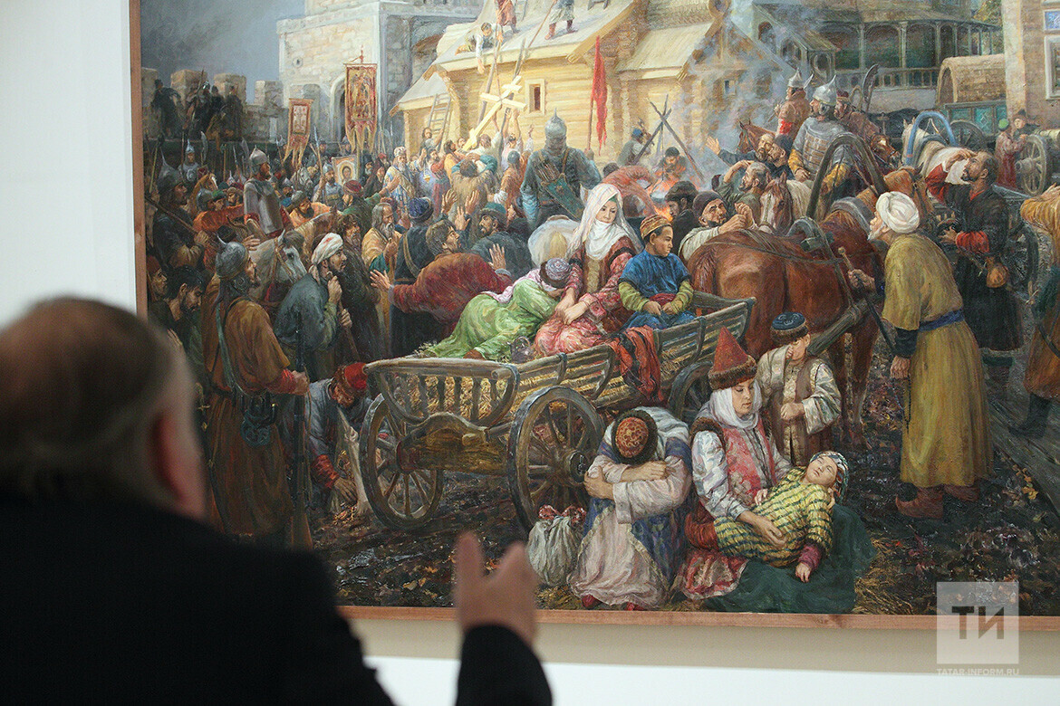 «Люди на картине „События октября 1552 года“ не просто придуманы, многие персонажи списаны с натуры. Например, женщина на телеге в платке и та, что сидит внизу, держа на руках ребенка, — это балерина Айгуль Гишьмутдинова, которая живет в Санкт-Петербурге. А левее в окровавленной чалме — сын мой, Шах-Али (касимовский хан, сражавшийся на стороне Ивана Грозного — прим. Т-и) — другой мой сын», — рассказал «Татар-информу» Фиринат Халиков.