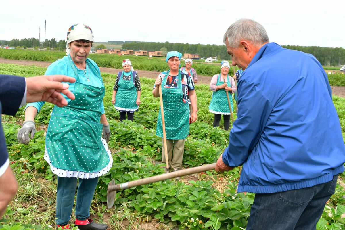 Пройдя по полю клубники и поработав на нем мотыгой, Минниханов сказал местным работницам с улыбкой: «Нормально? Мы тоже школу молодого бойца проходили!»