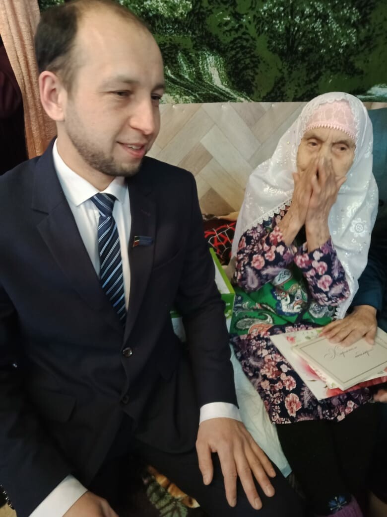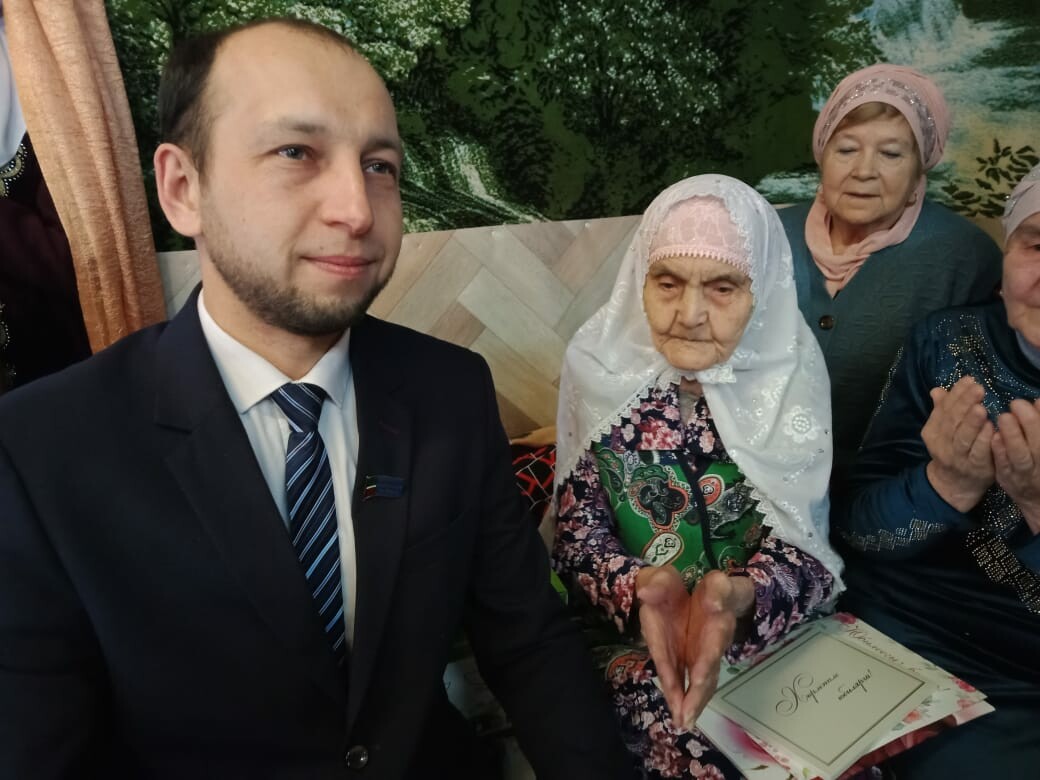 Поздравить Райхану Валиеву от имени главы муниципального района приехал его заместитель Ильнур Гиниятов. Он зачитал поздравительный адрес от Президента РФ Владимира Путина и Раиса Республики Татарстан Рустама Минниханова и вручил подарок.
