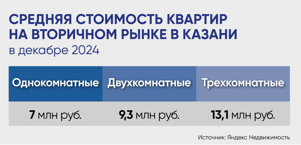 «Вторичка» в Казани за год подросла в цене в среднем на 14,8%. В декабре 2024-го кв. м. стоил в среднем около 172 тыс. рублей, а в целом «однушку» на вторичном рынке можно было купить за 7 млн, «двушку» – за 9,3 млн, а «трешку» – за 13,1 млн рублей, сообщил «Татар-информу» коммерческий директор «Яндекс Недвижимости» Евгений Белокуров.