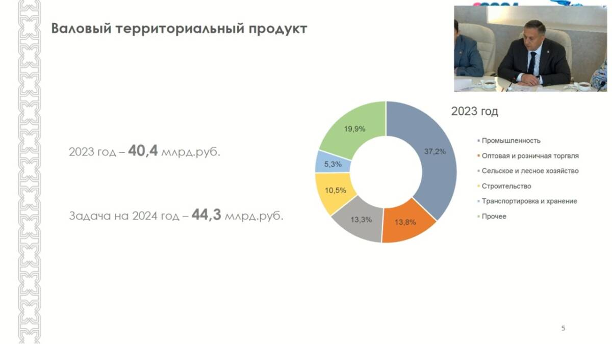 По итогам года валовый территориальный продукт должен составить 44,3 млрд рублей. Это на 3,9 млрд больше, чем в прошлом году, когда он достигал 40,4 млрд рублей. Большую часть в 2023 году в нем занимали промышленность – 37,2%, оптовая и розничная торговля – 13,8%, сельское и лесное хозяйство – 13,3%.