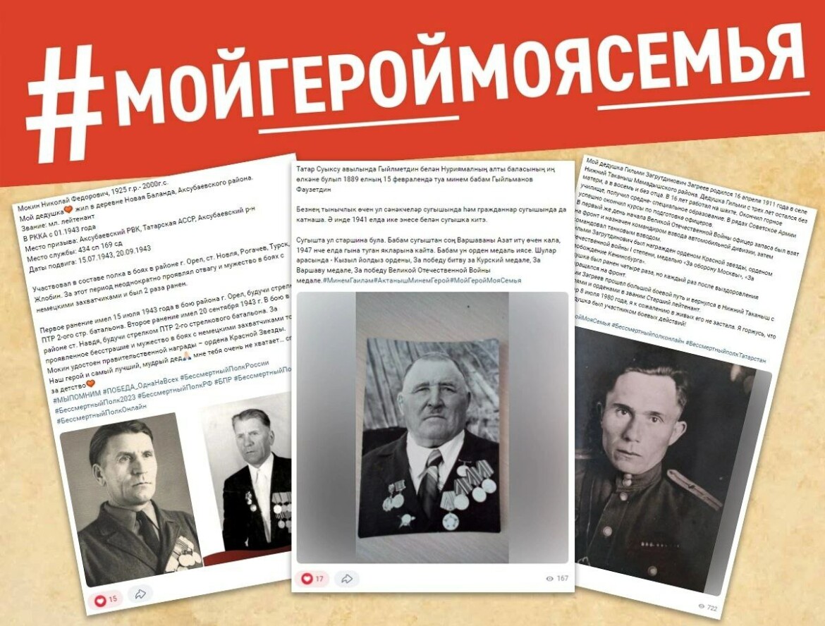 Онлайн-флешмоб #МойГеройМояСемья организовали журналисты Татарстана. Акция стартовала 26 апреля 2023 года. К ней может присоединиться каждый житель республики. Для этого участникам предлагается опубликовать истории подвигов героев вашей семьи — участников Великой Отечественной войны 1941-1945 гг. в социальной сети «ВКонтакте» и поставить хештег #МойГеройМояСемья.