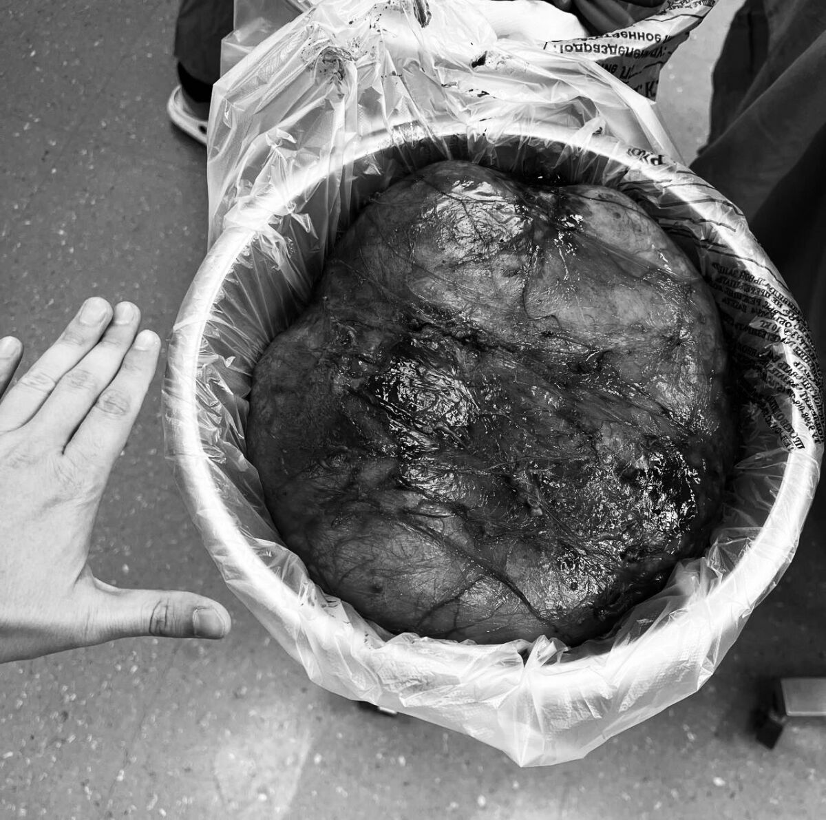 Злокачественная опухоль липосаркома образовалась из жировых клеток в забрюшинном пространстве. Огромное новообразование выросло всего за два месяца.