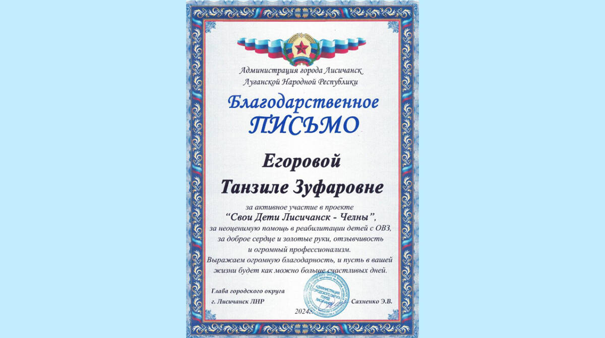 У «Детей ДЦП» многолетний опыт, квалифицированные специалисты, современное медицинское оборудование, убедительные результаты работы, много соратников и партнеров. Опираясь на это, Тянзиля Егорова решила предложить помощь лисичанским детям. На одной из встреч представителей челнинских общественных организаций она услышала рассказ Рустама Гатина о нашем городе. Он уже знал, сколько у нас детей с ДЦП, успел познакомиться с единственным в Лисичанске детским неврологом Еленой Дорониной и главным врачом горбольницы Еленой Олексюк.