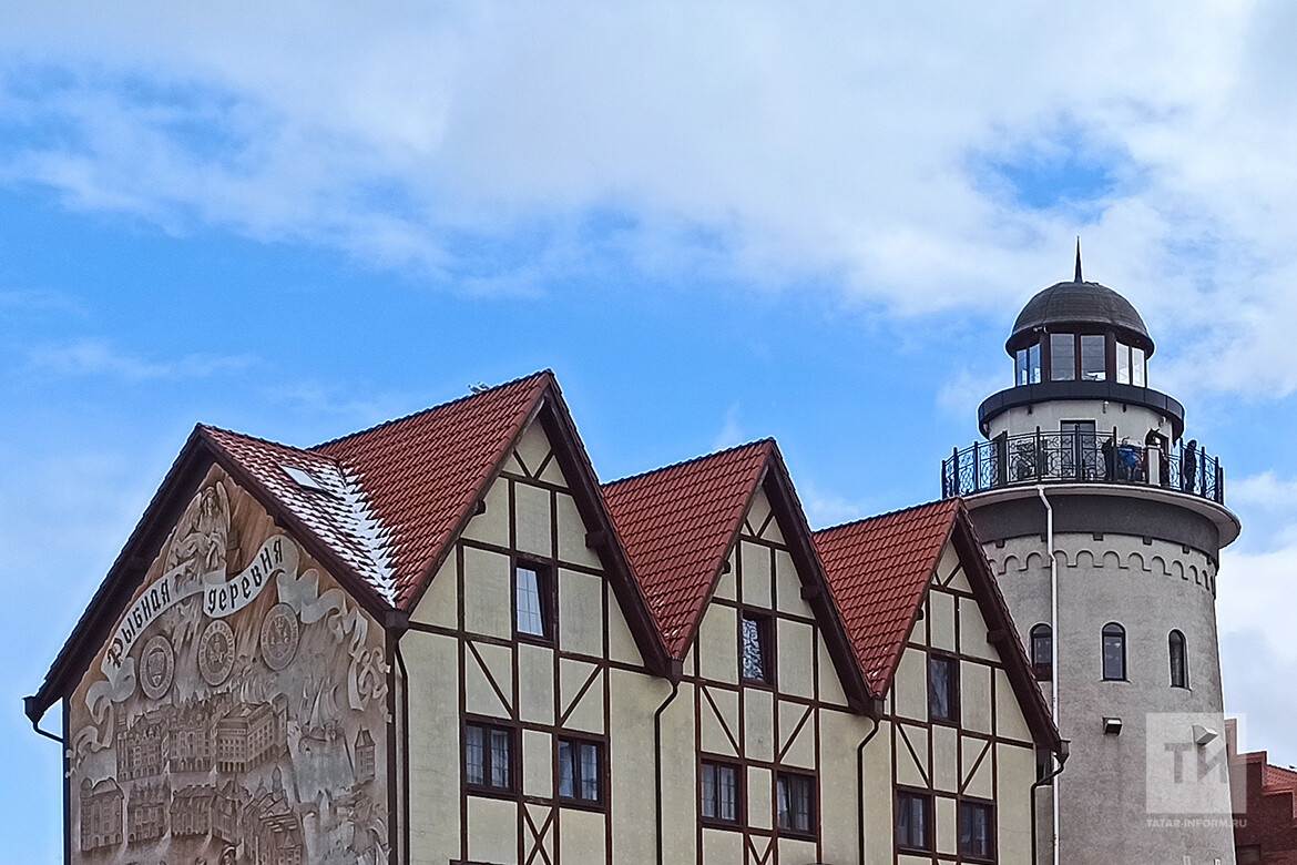 Комплекс «Рыбная деревня» в немецком стиле фахверк построен совсем недавно — в 2006-2010 годах. Раньше весь Кенигсберг состоял из таких домов, но в современном Калининграде их осталось совсем немного. Отличительная черта такого стиля в том, что опорные и несущие конструкции здания выведены на фасад. Еще в «Рыбной деревне» есть смотровая башня в виде маяка. На первом этаже расположена сувенирная лавка, на втором — ресторан, на третьем — маленький музей стекла, а на четвертом и пятом — собственно сама смотровая площадка.