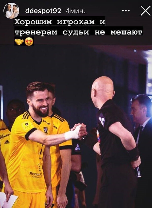 Футболист выложил в сториз на своей странице в Instagram совместное фото с футбольным судьей Сергеем Карасевым. «Хорошим игрокам и тренерам судьи не мешают», – подписал изображение Деспот.