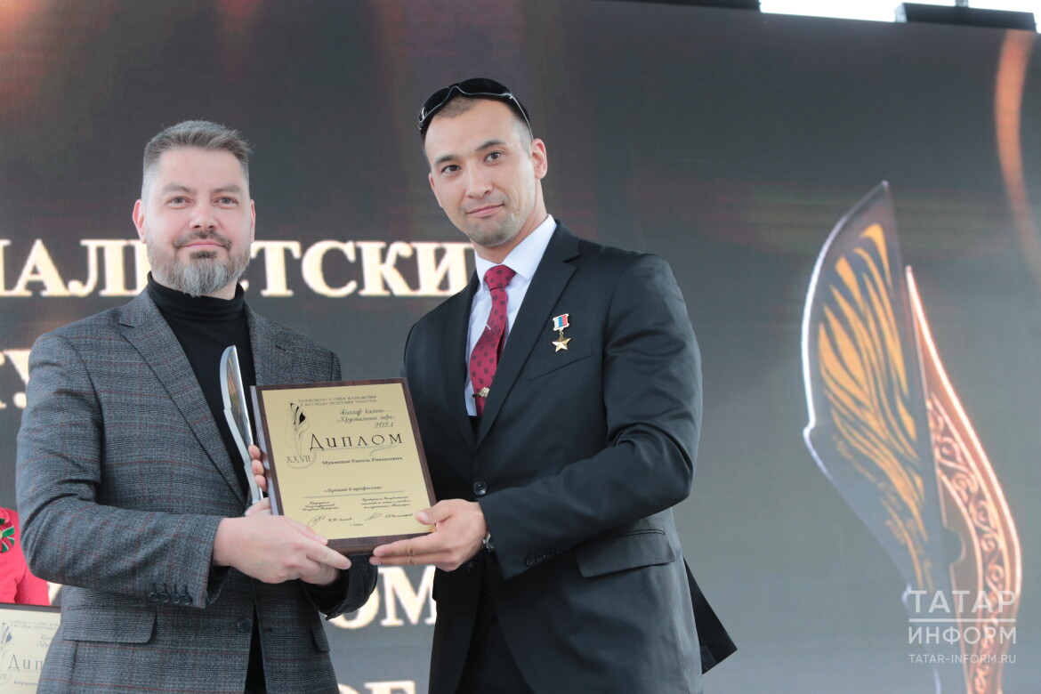 Победителя в номинации «Лучший в профессии» наградил Герой России Расим Баксиков. Им стал главный специалист отдела социальных медиа департамента СМИ АО «ТАТМЕДИА» Равиль Мукменов