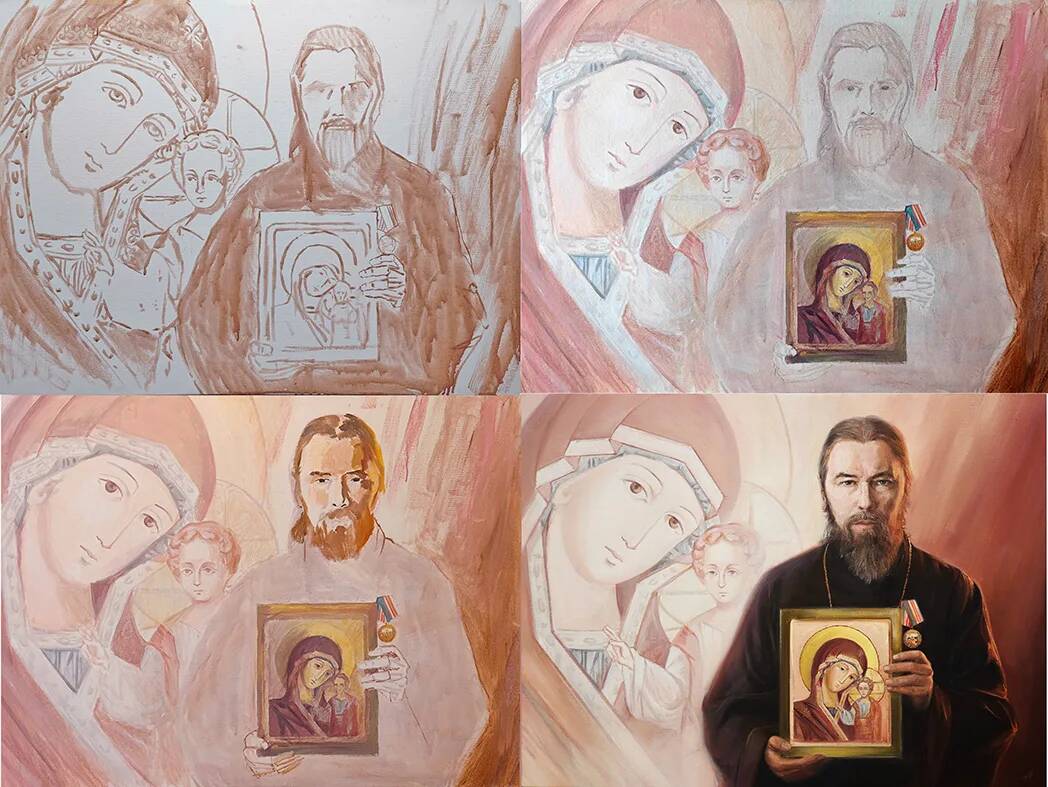 Новое полотно посвящено благочинному Нижнекамского округа, протоиерею Александру Колчерину. На картине он изображен со списком Казанской иконы Божией Матери – одного из наиболее почитаемых образов в православной традиции.