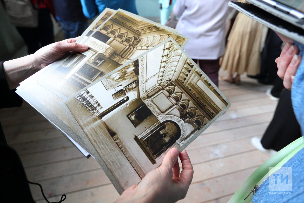 Проводя представителей СМИ далее по зданию, Ирада Аюпова отметила, что в учительском крыле Казанской художественной школы семь исторических дизайнов дверей. В бальном зале сохранилась витиеватая лепнина, где можно увидеть отдельные элементы – палитру, кисти, угольники, но отсутствует с советских времен ростовой портрет Николая II и двуглавый орел на арке над ним. Отсутствующие элементы видно на старых фотографиях, которые продемонстрировала Ольга Гильмутдинова.