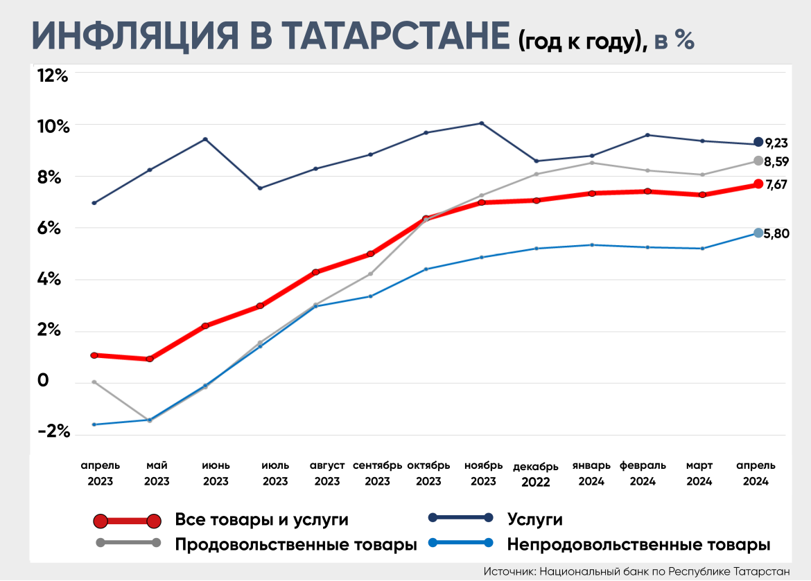 «Средний» по Татарстану рост цен в апреле разогнался исключительно из-за розничной торговли – на продукты инфляция ускорилась до 8,6% с 8,1% в марте, в непродовольственном сегменте – до 5,8% с 5,2%. А вот рост цен в сегменте услуг продолжил сбавлять обороты, в апреле до 9,2% с мартовских 9,4%.