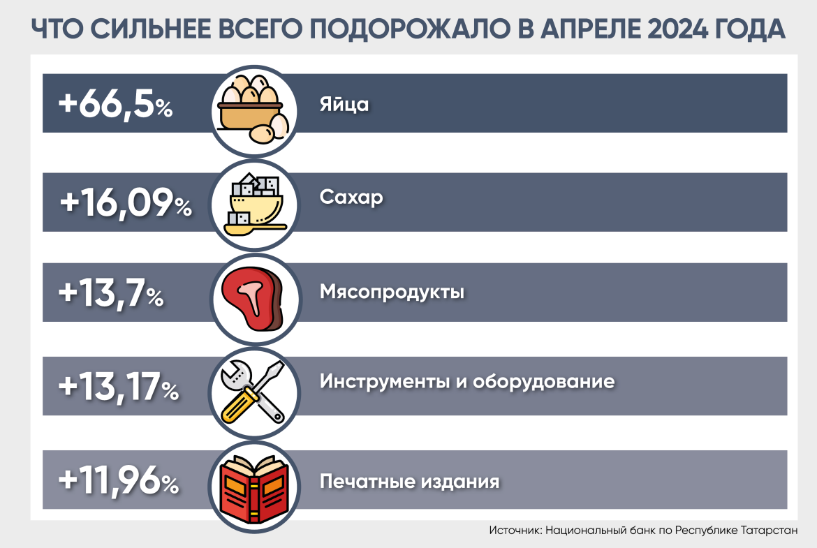 В Нацбанке Татарстана объяснили, что производители «переносили в цены возросшие ранее издержки», например на логистику и оплату труда. В результате в апреле говядина, мясные полуфабрикаты, колбасные изделия и молочная продукция (в годовом выражении) дорожали быстрее, чем в марте.