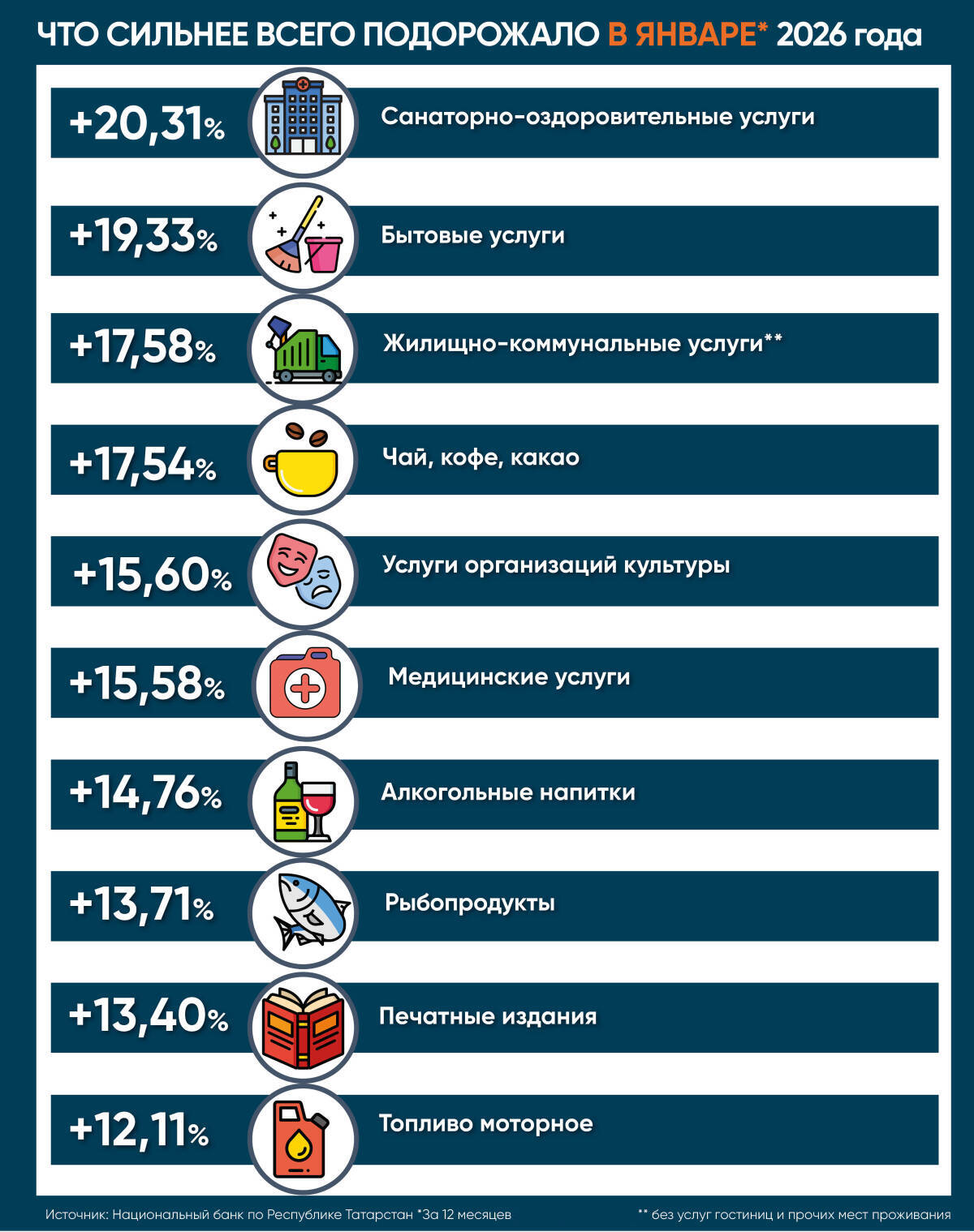Из-за традиционного январского пересмотра тарифов в первом месяце года скакнули цены на жилищно-коммунальные услуги и проезд на городском пассажирском транспорте (за год они увеличились на 17,58% и на 7,91% соответственно). А из-за роста расходов, в том числе на персонал, выросла стоимость и проживания в гостиницах.