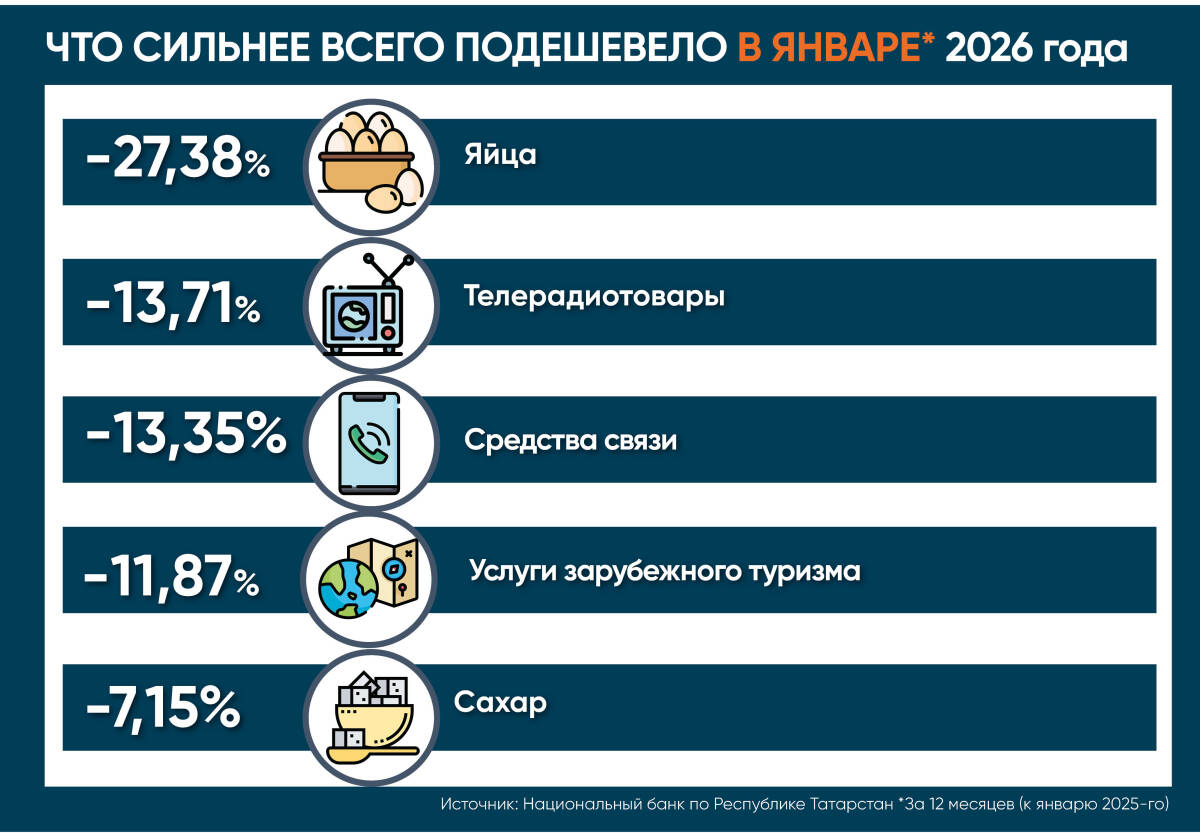 По сравнению с январем 2025-го в республике заметнее, чем по РФ, выросли цены на продукты питания (сыр, рыбопродукты, чай, кофе, какао) и услуги (санаторно-оздоровительные, бытовые и жилищно-коммунальные). Меньше – на непродовольственные товары. При этом базовая инфляция в Татарстане снова снизилась – с 6,29% в декабре до 5,93% в январе (по РФ – практически не изменилась, с 5,44% до 5,43%).