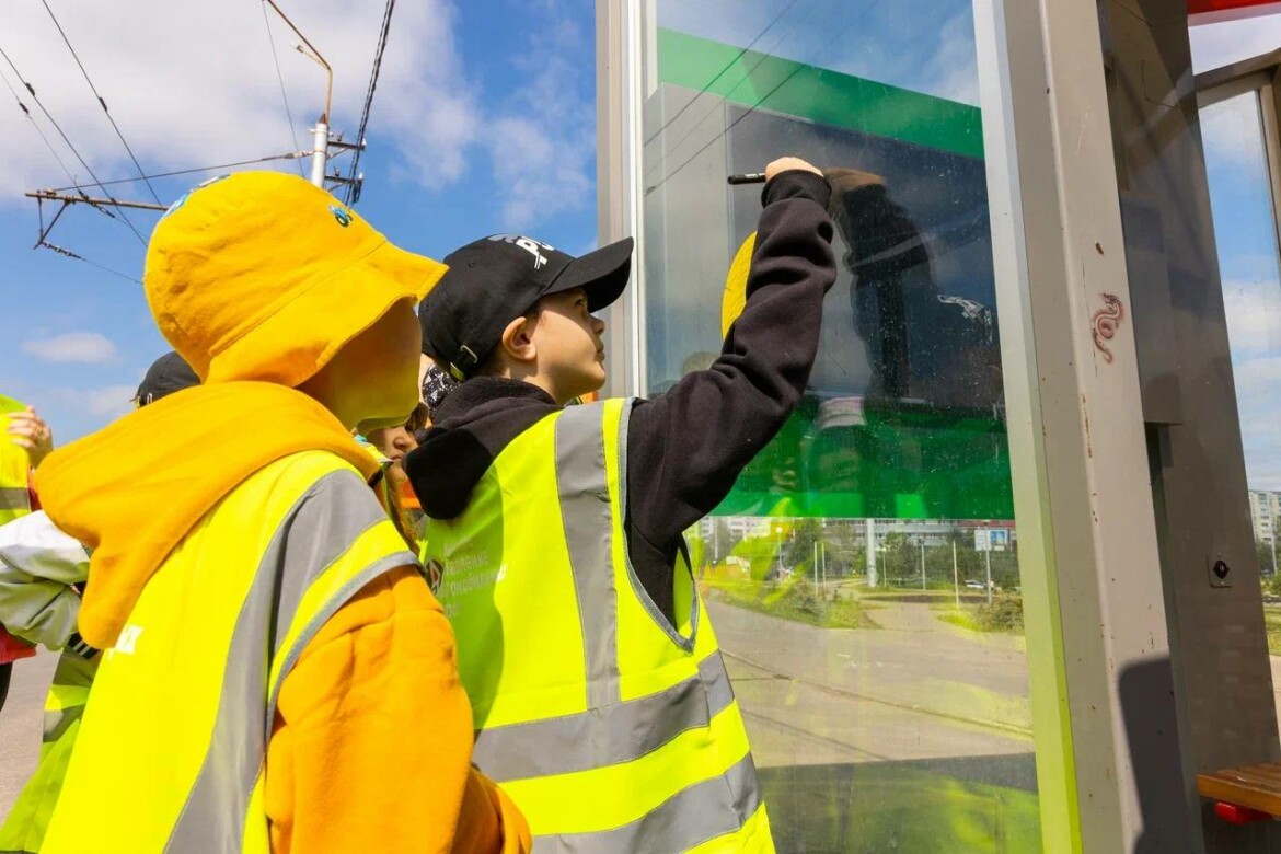 Ребятам показали, как происходит очистка остановочных павильонов и заборов, также школьники смогли нарисовать и очистить поверхность от граффити. Затем они отправились на кольцевую развязку, где им продемонстрировали, как правильно ухаживать за зелеными насаждениями — высаживать цветы и скашивать траву.