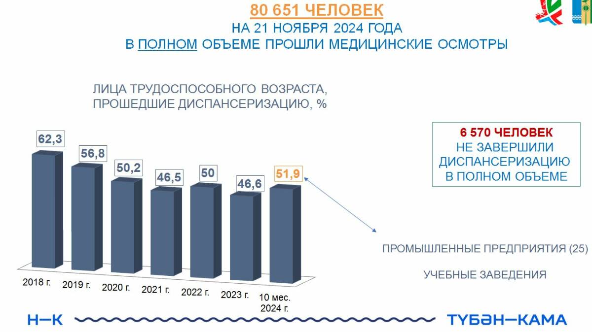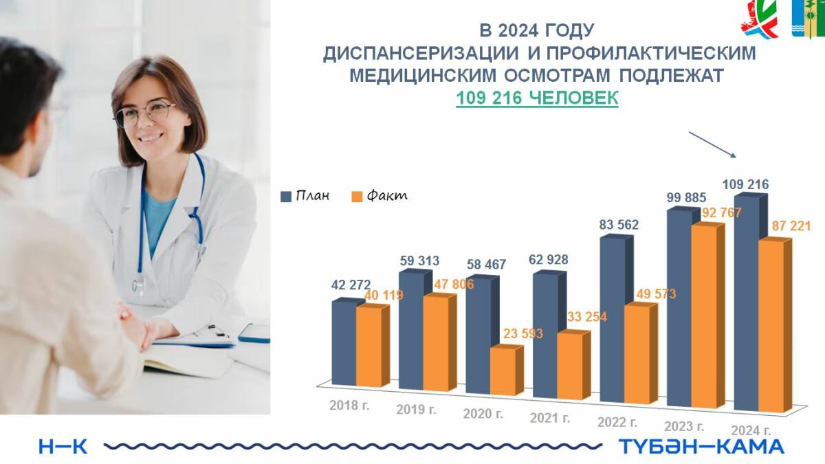 В этом году почти 110 тыс. нижнекамцев в возрасте старше 18 лет должны пройти осмотры и получить рекомендации по сохранению и укреплению здоровья. На 21 ноября лишь 87 тыс. жителей обратились в медицинские организации города и района.