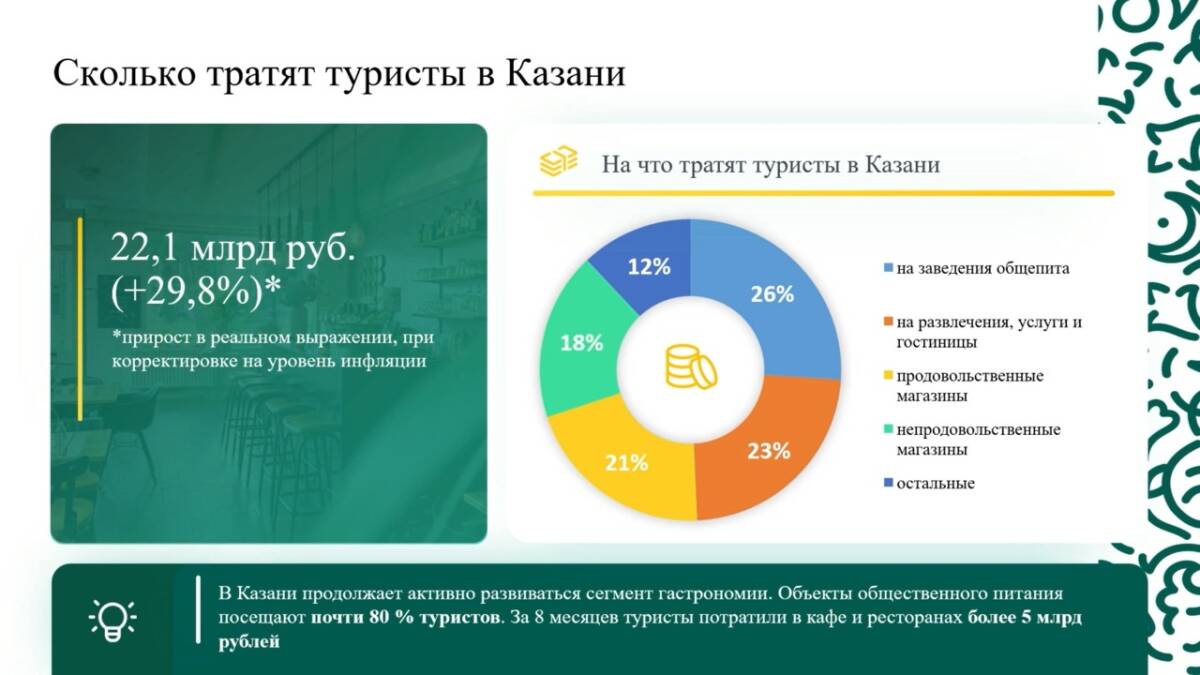 За 8 месяцев 2024 года туристы потратили в столице Татарстана 22,1 млрд рублей, превзойдя показатель 2023 года почти на 30%. Об этом на деловом понедельнике рассказала директор Комитета по развитию туризма Казани Дарья Санникова.